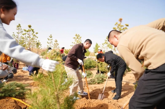 在各植樹點,黨旗在大漠上飄揚。在治沙專家指導下,植樹隊伍分工明確,因地制宜采用不同技術,確保栽植質量,讓每一棵苗扎根生長,現場忙碌而有序。