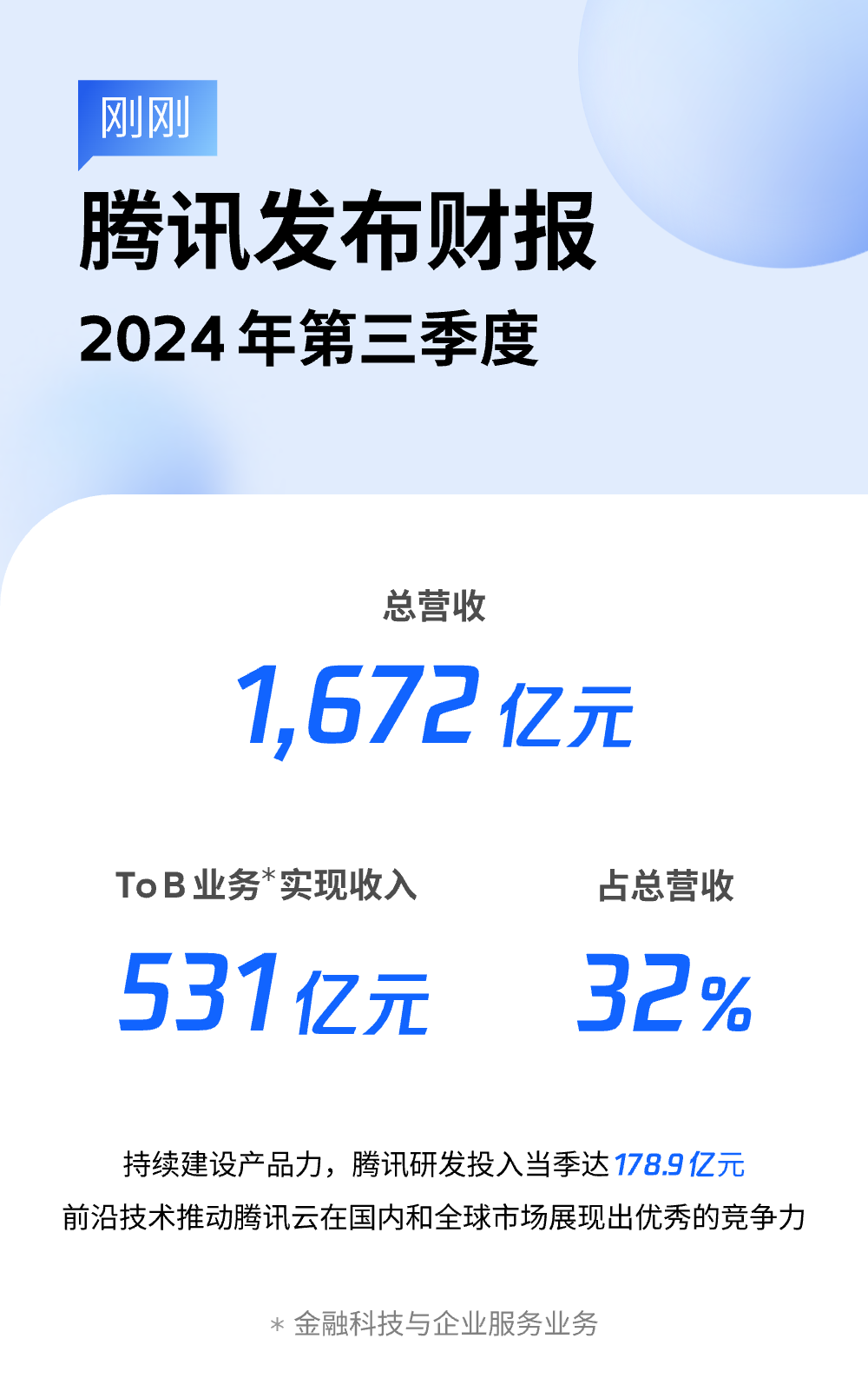 中國經(jīng)濟(jì)網(wǎng)北京11月14日訊(記者 李方) 11月13日,騰訊發(fā)布2024年Q3財報,當(dāng)季度騰訊總營收1672億元,同比增長8%。騰訊ToB業(yè)務(wù)(金融科技及企業(yè)服務(wù))實現(xiàn)營收531億元,占騰訊總營收的32%。其中,企業(yè)服務(wù)的收入增長受益于云服務(wù)和商家技術(shù)服務(wù)費推動,毛利受益于結(jié)構(gòu)優(yōu)化、效率提升獲得顯著增長。