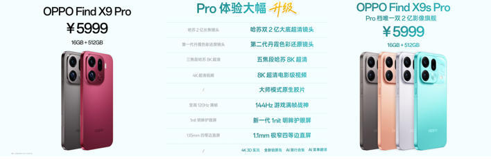 劉作虎在發(fā)布會(huì)上公布價(jià)格時(shí)表示,相比Find X9 Pro,在影像、設(shè)計(jì)、屏幕、性能到體驗(yàn)都巨大升級(jí)的Find X9s Pro,起售價(jià)與上代持平不漲價(jià),同為5299元,主力銷售的16+512版本則為5999元。