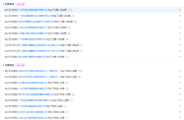 值得注意的是,天眼查顯示,近年來,江西登云健康美業互聯有限公司多名股東企業及多家投資企業主要人員變動頻繁。如,2016年以來,該公司投資的廣東可諾丹婷美容服務有限公司發生主要人員變更累計12次;該公司的股東吉安市井開區美云商務咨詢中心(有限合伙)發生投資人變更累計10次。