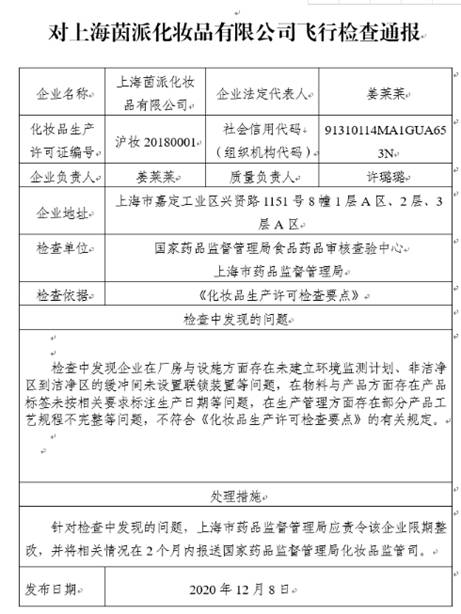 飛行檢查報告顯示,在檢查中發現上海茵派化妝品有限公司在廠房與設施方面存在未建立環境監測計劃、非潔凈區到潔凈區的緩沖間未設置聯鎖裝置等問題,在物料與產品方面存在產品標簽未按相關要求標注生產日期等問題,在生產管理方面存在部分產品工藝規程不完整等問題。