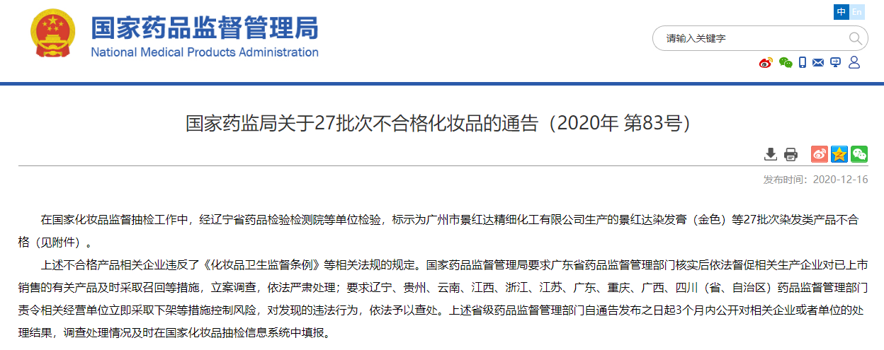 在國家化妝品監(jiān)督抽檢工作中,經(jīng)遼寧省藥品檢驗檢測院等單位檢驗,標(biāo)示為廣州市景紅達精細化工有限公司生產(chǎn)的景紅達染發(fā)膏(金色)等27批次染發(fā)類產(chǎn)品不合格。