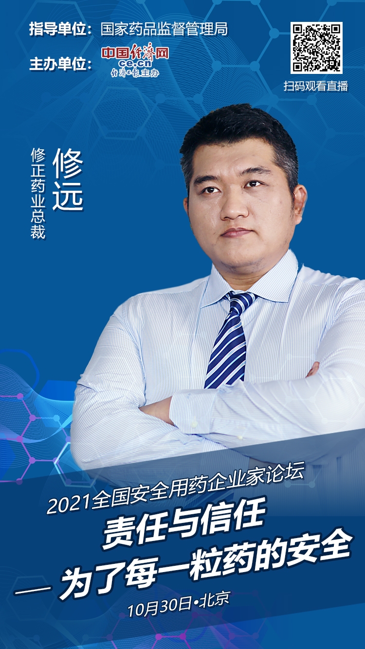 中國經濟網北京10月30日訊(記者 郭文培) “安全、有效、可及是藥品的三大根本問題。其中,安全是排在第一位的。”10月30日,在中國經濟網舉辦的2021全國安全用藥企業家論壇上,修正藥業總裁修遠談安全用藥。他說,安全用藥,人是根本、原材料是源頭、生產工藝是關鍵、監督檢驗是保障、科技研發是引領。
