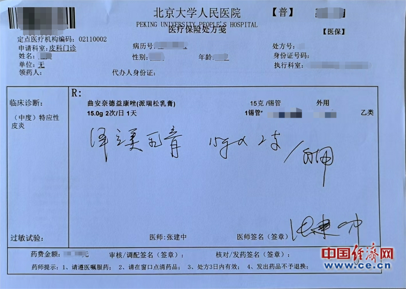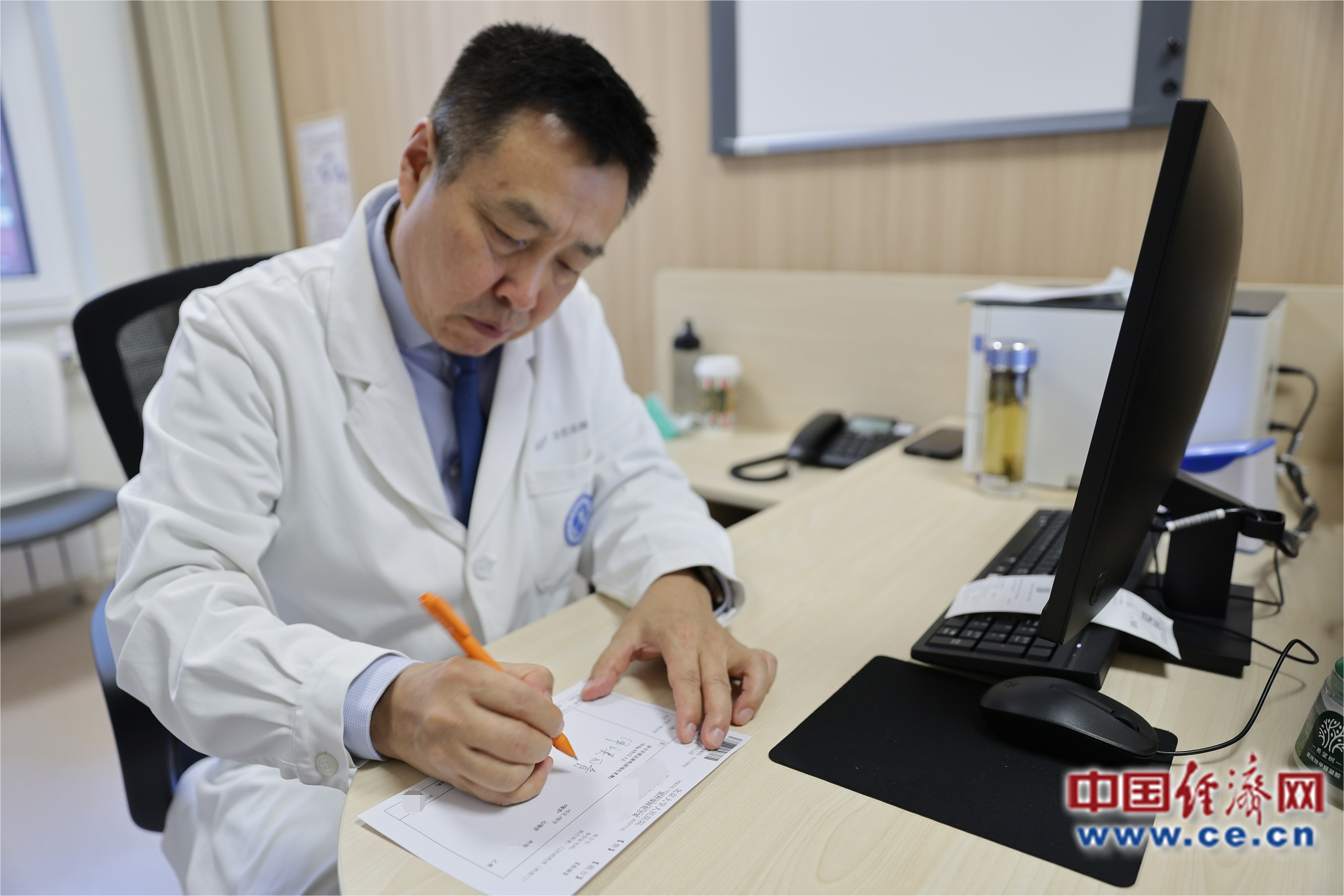 圖為北京大學(xué)人民醫(yī)院皮膚科張建中教授為患者開出首張?zhí)幏?中國經(jīng)濟網(wǎng)裴小閣攝