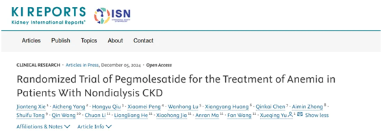 近日,國際腎臟病領域著名期刊Kidney International Reports(IF:5.7/Q1)在線發表了由廣東省人民醫院余學清教授牽頭的培莫沙肽注射液(商品名:圣羅萊)在非透析腎性貧血患者中開展的Ⅲ期臨床研究數據。