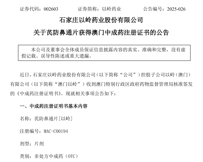 7月11日晚,以嶺藥業發布公告稱,該公司控股子公司以嶺(澳門)有限公司收到澳門特別行政區政府藥物監督管理局(以下簡稱“澳門藥監局”)核準簽發的《中成藥注冊證明書》。