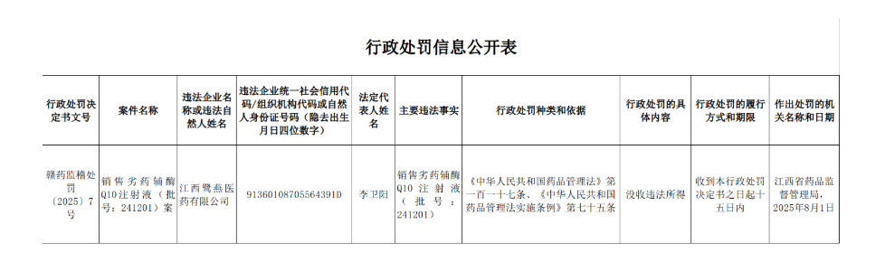 中國經(jīng)濟(jì)網(wǎng)北京8月11日訊(記者 郭文培) 江西省藥品監(jiān)督管理局日前披露的一則行政處罰信息顯示,江西鷺燕醫(yī)藥有限公司銷售劣藥輔酶Q10注射液(批號:241201)被江西省藥品監(jiān)督管理局沒收違法所得。