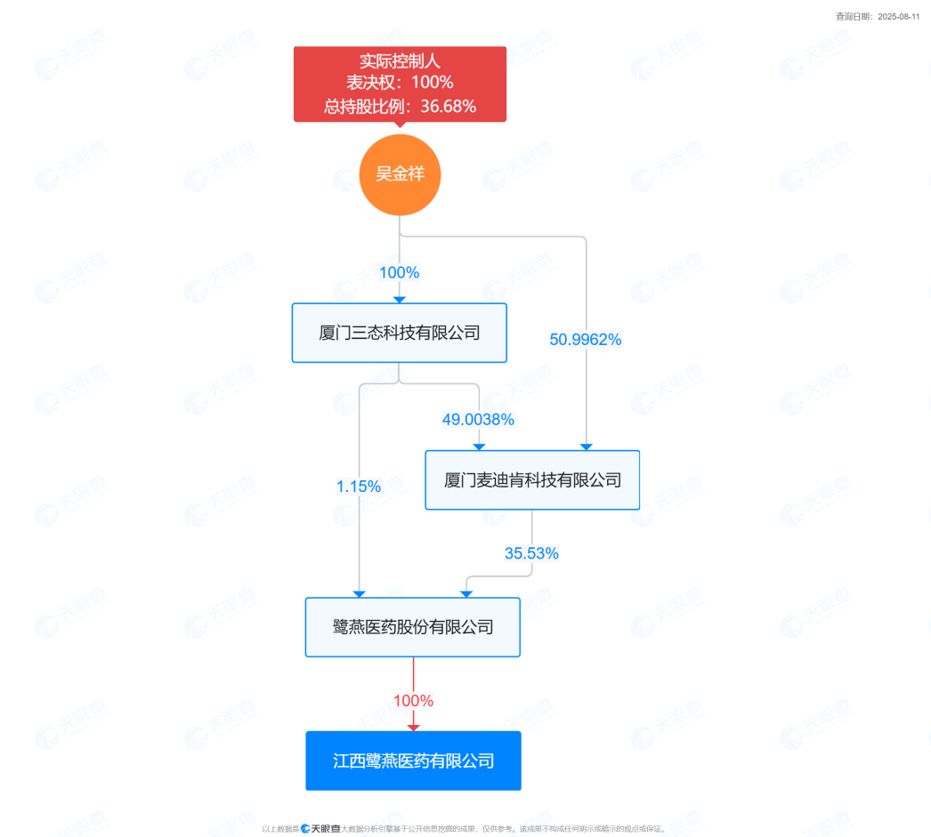 根據(jù)天眼查,江西鷺燕醫(yī)藥有限公司曾用名為江西贛衛(wèi)醫(yī)藥有限公司,成立于1998年,是一家以從事批發(fā)業(yè)為主的企業(yè),系A股上市公司鷺燕醫(yī)藥全資子公司,實控人為吳金祥。