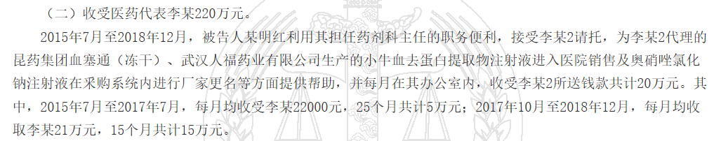根據(jù)判決書,2015年7月至2018年12月,被告人某明紅利用其擔(dān)任藥劑科主任的職務(wù)便利,接受“李某2”請托,為“李某2”代理的昆藥集團(tuán)血塞通(凍干)、武漢人福藥業(yè)有限公司生產(chǎn)的小牛血去蛋白提取物注射液進(jìn)入醫(yī)院銷售及奧硝唑氯化鈉注射液在釆購系統(tǒng)內(nèi)進(jìn)行廠家更名等方面提供幫助,并每月在其辦公室內(nèi),收受“李某2”所送錢款共計(jì)20萬元。