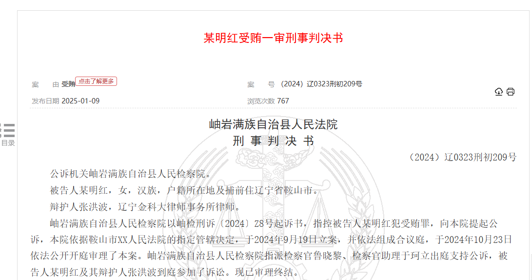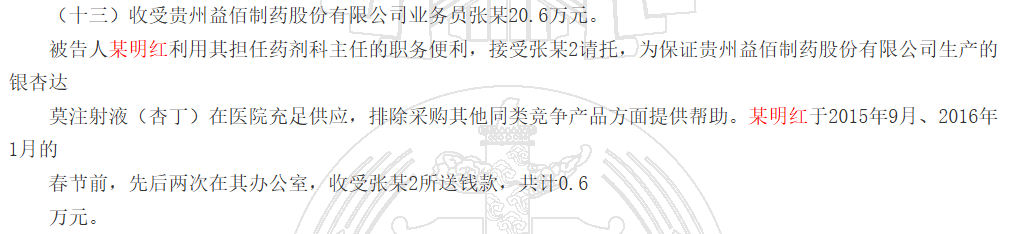 根據判決書,被告人某明紅利用其擔任藥劑科主任的職務便利,接受貴州益佰制藥股份有限公司業務員“張某2”請托,為保證貴州益佰制藥股份有限公司生產的銀杏達莫注射液(杏丁)在醫院充足供應,排除采購其他同類競爭產品方面提供幫助。某明紅于2015年9月、2016年1月的春節前,先后兩次在其辦公室,收受“張某2”所送錢款,共計0.6萬元。