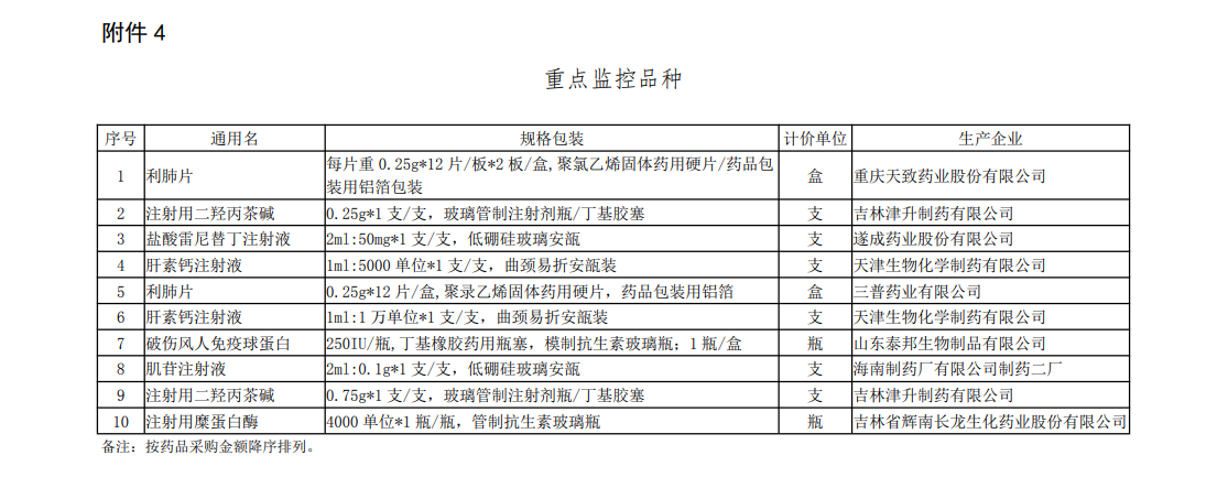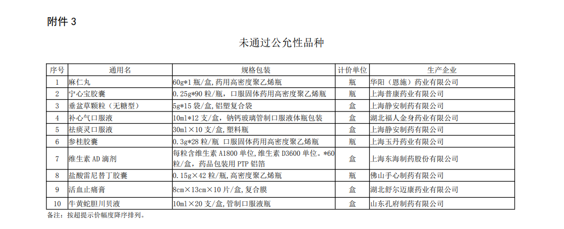 譬如,新申請超“黃線”品種名單中,北京同仁堂科技發展股份有限公司制藥廠麻仁潤腸軟膠囊、云南白藥集團股份有限公司云南白藥氣霧劑系獨家品種;原在庫超“黃線”品種名單中,浙江泰利森藥業有限公司瑞格列奈二甲雙胍片(II)是獨家品種;未通過公允性品種名單中,湖北福人金身藥業有限公司補心氣口服液、上海玉丹藥業有限公司參桂膠囊是獨家品種;重點監控品種名單中,吉林津升制藥有限公司注射用二羥丙茶堿為獨家品種。