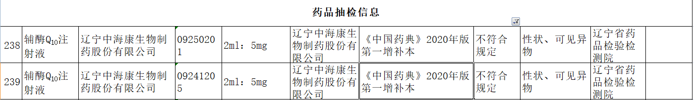 根據公告,該2批次不合格輔酶Q10注射液,標示生產企業為遼寧中海康生物制藥股份有限公司,生產批號為09250201、09241205,規格為2ml:5mg,不符合項目為性狀、可見異物。