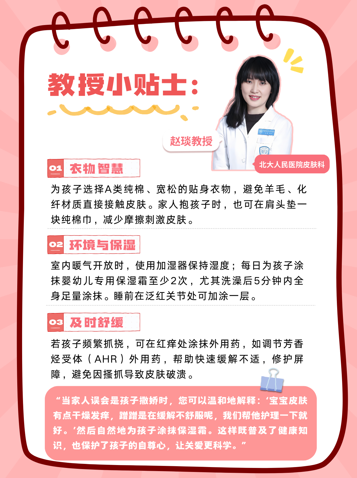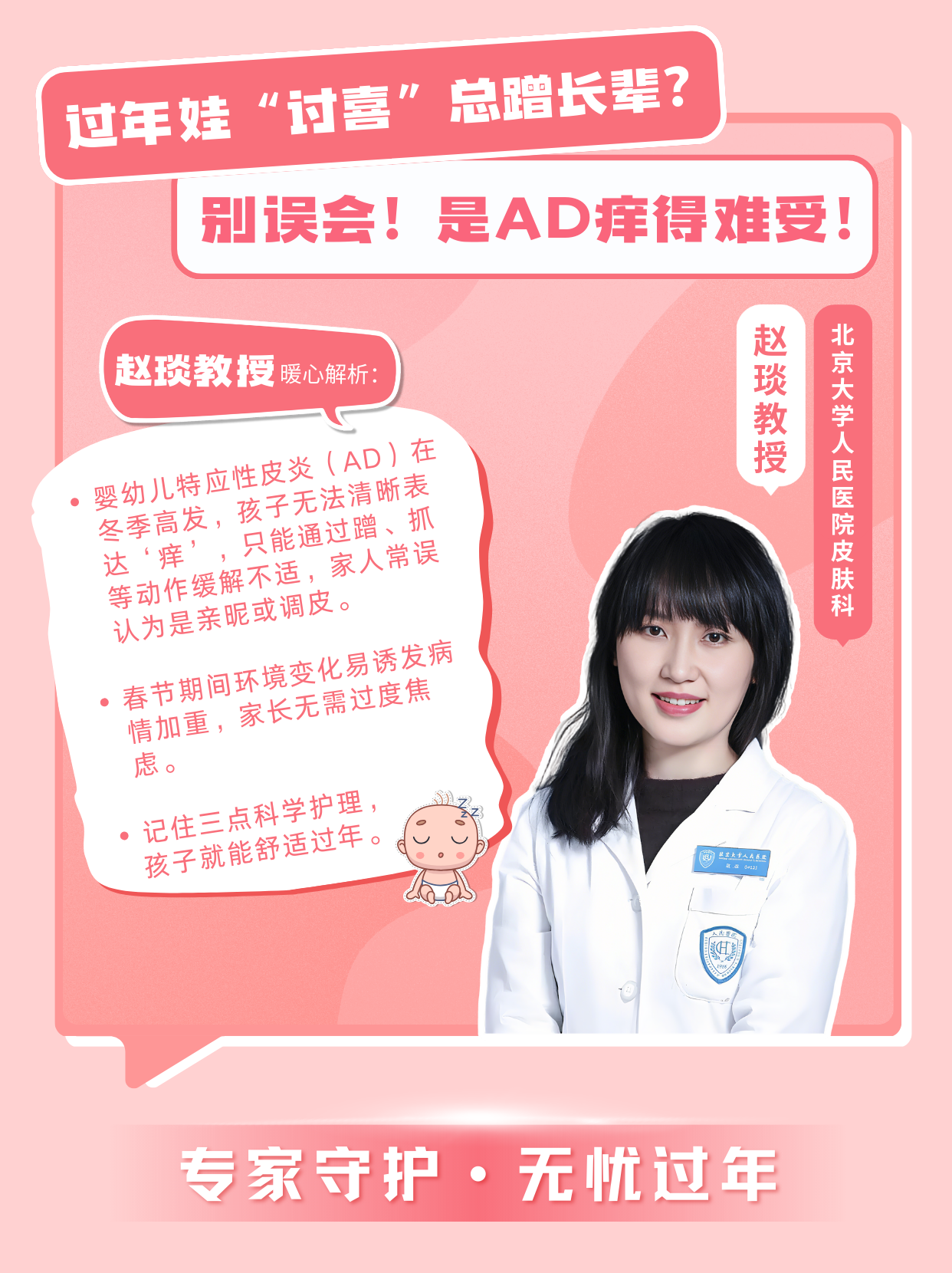 “嬰幼兒特應性皮炎(AD)在冬季高發,孩子無法清晰表達‘癢’,只能通過蹭、抓等動作緩解不適,家人常誤認為是親昵或調皮。春節期間環境變化易誘發病情加重,家長無需過度焦慮,記住三點科學護理,孩子就能舒適過年: