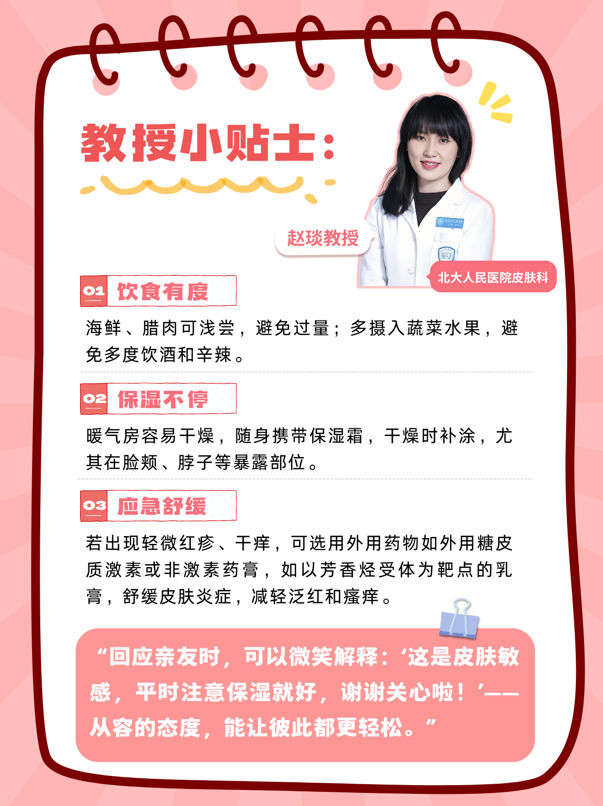 “回應親友時,可以微笑解釋:‘這是皮膚敏感,平時注意保濕就好,謝謝關心啦!’——從容的態度,能讓彼此都更輕松。”