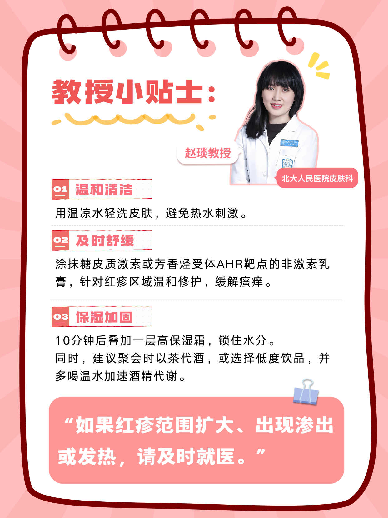 “酒精會擴張血管、加劇皮膚炎癥,特皮患者尤其需節制。若已出現紅疹干癢,請按以下步驟處理: