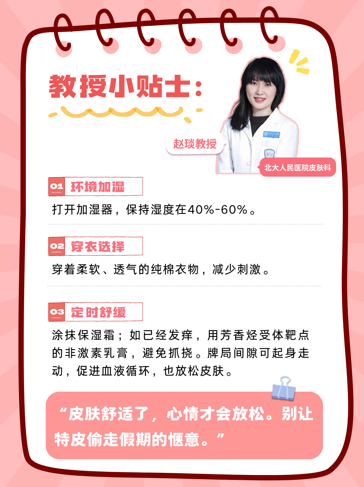 3.定時舒緩:涂抹保濕霜;如已經發癢,用芳香烴受體靶點的非激素乳膏,避免抓撓。牌局間隙可起身走動,促進血液循環,也放松皮膚。”