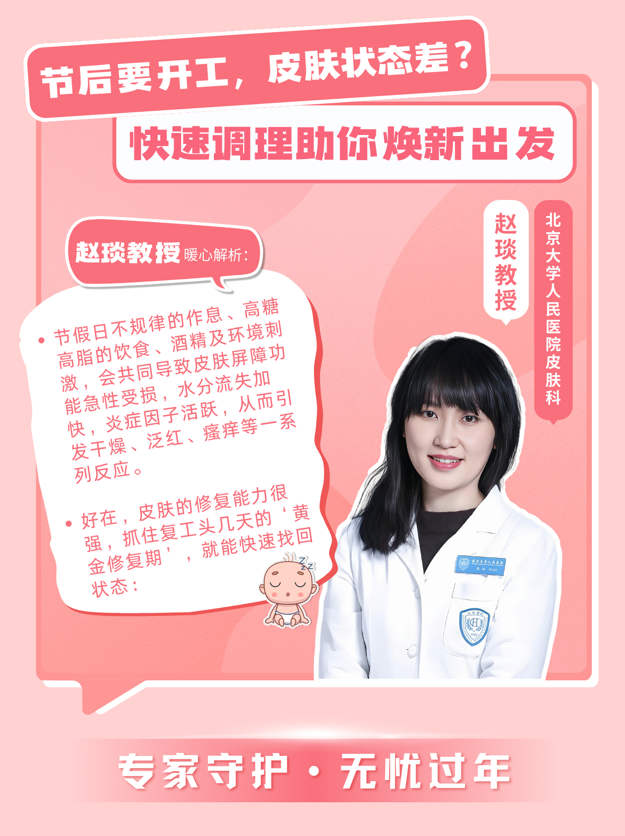 “節假日不規律的作息、高糖高脂的飲食、酒精及環境刺激,會共同導致皮膚屏障功能急性受損,水分流失加快,炎癥因子活躍,從而引發干燥、泛紅、瘙癢等一系列反應。好在,皮膚的修復能力很強,抓住復工頭幾天的‘黃金修復期’,就能快速找回狀態:”