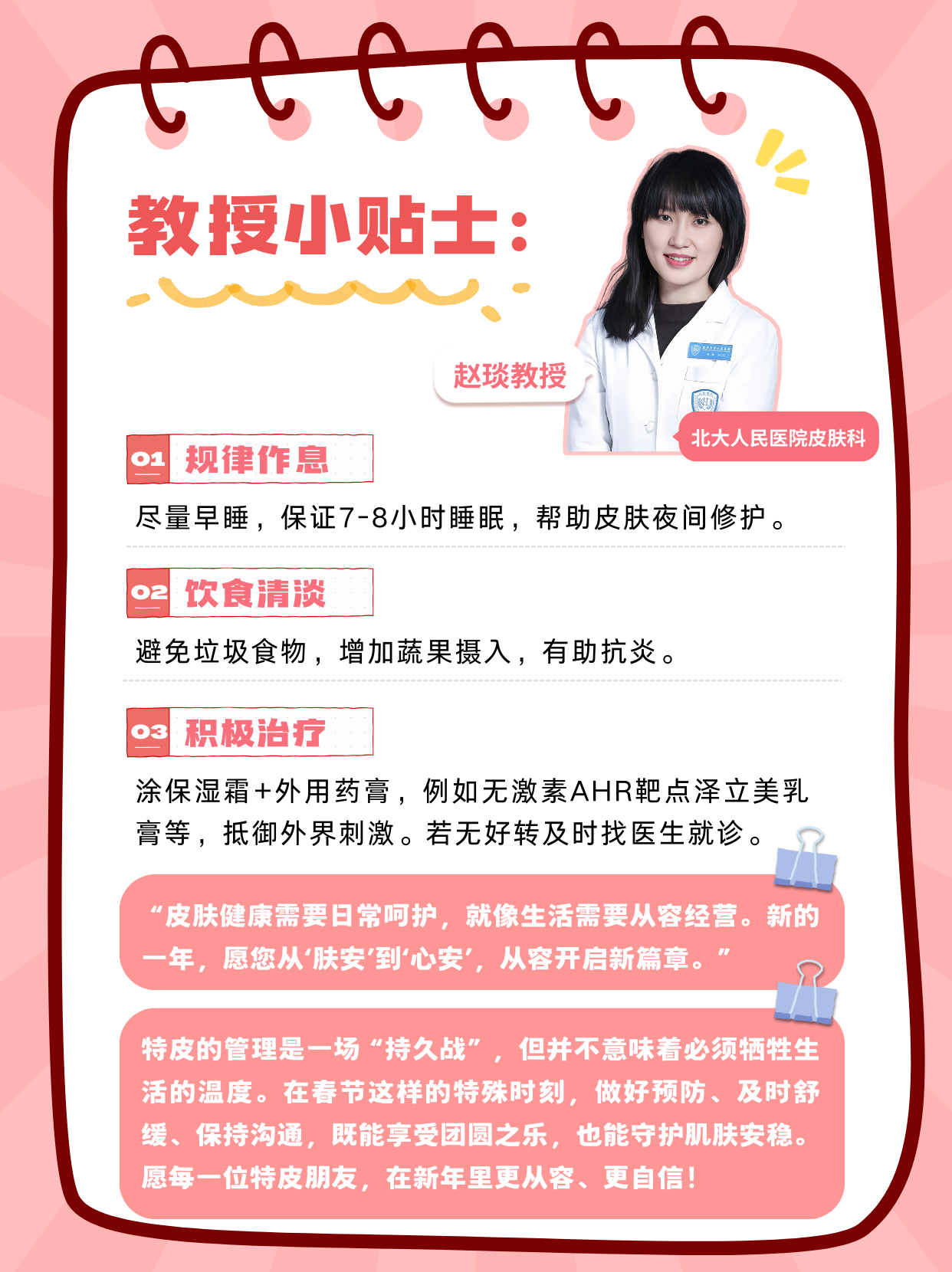 特皮的管理是一場“持久戰”,但并不意味著必須犧牲生活的溫度。在春節這樣的特殊時刻,做好預防、及時舒緩、保持溝通,既能享受團圓之樂,也能守護肌膚安穩。愿每一位特皮朋友,在新年里更從容、更自信!