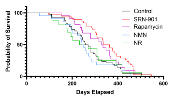 此次試驗耗時數年,以18月齡(約相當于人類50多歲)自然衰老的正常小鼠為研究對象,持續觀察至其自然死亡。結果顯示,接受SRN-901治療的小鼠中位剩余壽命延長33%,死亡風險降低46%。