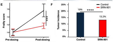 研究團隊還采用24項臨床虛弱指數評估體系量化健康狀態,結果表明SRN-901使小鼠衰老速度減緩70%,腫瘤發病率也下降了30.53%。