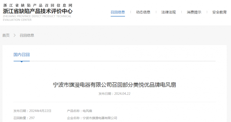 目前,寧波市旗漫電器有限公司受缺陷調(diào)查影響按照《消費品召回管理暫行規(guī)定》的要求,主動向浙江省市場監(jiān)督管理局和寧波市市場監(jiān)督管理局報告了召回計劃,將自即日起,召回2023年5月22日至25日期間制造的部分美悅優(yōu)品牌型號QM-LD001電風扇(循環(huán)扇),涉及數(shù)量297臺。