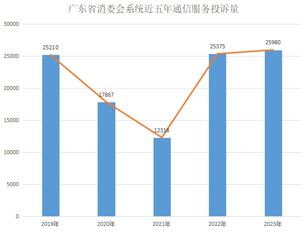 《報告》顯示,2019年至2023年,廣東省消委會系統共收到通信服務投訴106750件,占投訴總量的5.12%,呈現出先降后升的“V”字走勢。其中,前3年(2019年至2021年)相關投訴持續下降,從25210件降至12318件,平均降幅近三成。但隨著通信服務市場競爭日趨激烈、業務更加多元,2022年起通信投訴再度飆升,投訴量達25375件,同比上升106.00%,而2023年維持高位(25980件)。
