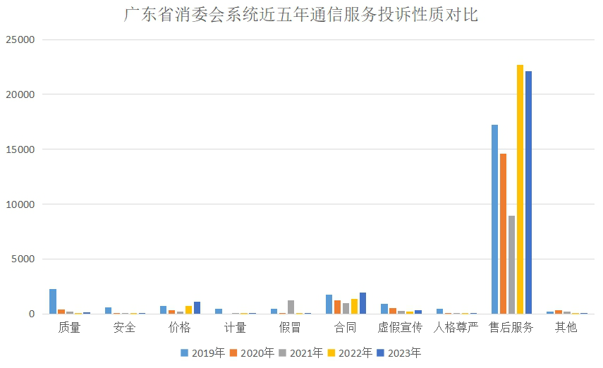 從投訴類別來看,近5年通信服務投訴95%以上集中在移動電話服務,與當前通信業發展現狀相符(2023年廣東固話、移動電話用戶數比例約為1:10)。從投訴性質來看,消費者反映的問題主要集中在售后服務、合同和價格3類,其中售后服務問題最為集中,占投訴總量的80.19%,是通信服務類投訴增長變化的主要因素。從地區分布來看,通信服務投訴集中在消費活躍的珠三角地區,主要與經濟發展狀況、人員密集程度相關。