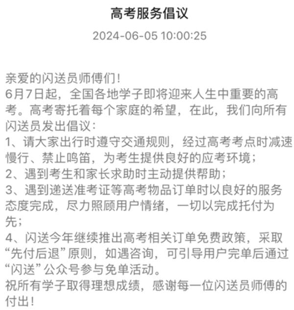 此外,閃送也向全國超過255萬閃送員發出倡議,號召騎手在高考期間文明騎行,主動向考生和家長提供幫助,用最好的精神面貌服務用戶,為高考加油。