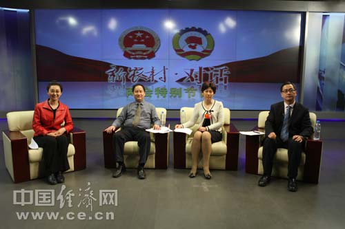 第十一屆全國人大代表、山東臨沭縣農業局農經中心主任劉建文,農業部全國農業技術推廣服務中心土肥處處長李榮,國家緩控釋肥工程技術研究中心副主任、山東金正大公司副總經理陳宏坤做客中國經濟網。(王耀峰 攝)