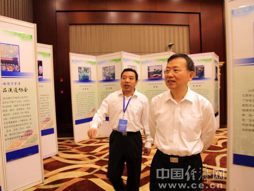2013年全國食品安全宣傳周啟動儀式暨第五屆中國食品安全論壇6月17日在北京舉辦,今年主題為“社會共治 同心攜手維護食品安全”。圖為公安部副部長黃明(右)參觀食品安全“誠信守望者”展覽。中國經濟網 王耀峰/攝
