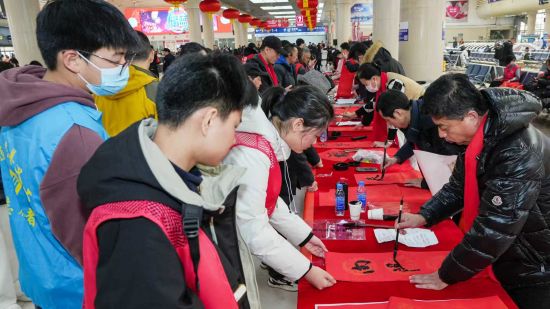 文化展示區里,傳統韻味與暖心服務交織成獨特風景。鐵路部門、大連車站派出所、大連市慈善總會、大連青年書協的書法愛好者們揮毫潑墨,一幅幅春聯、一個個福字飽含美好祝愿,免費送到旅客手中;紅包拓印體驗更讓大家親手解鎖新春儀式感,沉浸式感受傳統年俗的魅力。大連北站的非遺展示區人氣爆棚:剪紙藝人指尖生花,一張張馬年主題剪紙惟妙惟肖;吹糖人、面塑攤位前,孩子們圍攏觀望,老師傅們巧手翻飛,將滾燙的糖漿、柔軟的面團化作形態各異的小動物,引得陣陣歡呼;五谷畫展臺則以各色谷物為料,勾勒出寓意吉祥的新春圖景,讓旅客直觀感受傳統技藝的匠心與溫度。